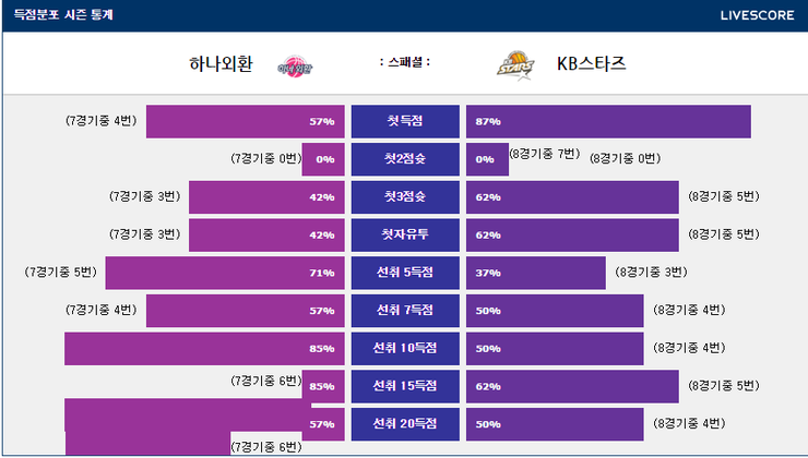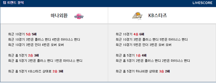 - KEB하나은행은 골밑 농구, KB스타즈는 외곽농구를 주로 사용하며 지난 우리은행 경기에서는 엄청난 외곽포로 우리은행을 침몰시켰습니다. 이번 경기에서도 외곽포가 터져준다면......