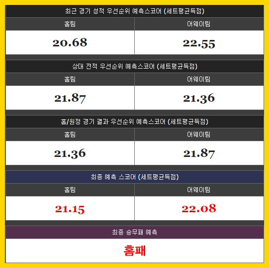 기준점은 184.5점이고 4세트 승부를 기준으로 패하는 팀이 세트당 21대22점을 기록해야 오버의 결과가 나올것이며